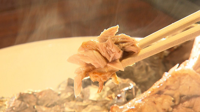 親鶏のコリコリ食感と炭火の香りに柚子胡椒。三田村さんも思わず一口クイっと🥃