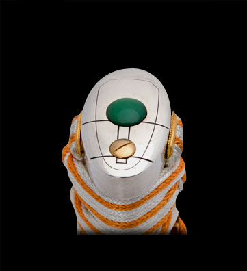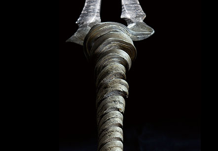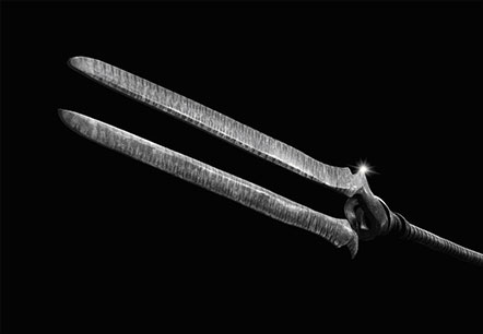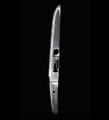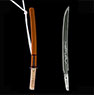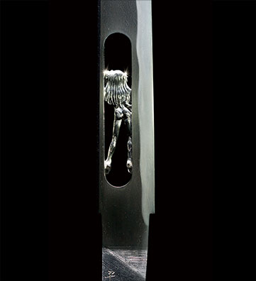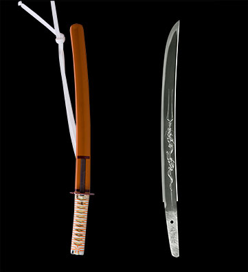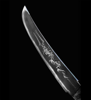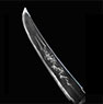 日本刀の特徴である「地肌」を強調するために、玉鋼やニッケルの合金を層状に重ねる技法でつくられた「ダマスカス鋼」を使用しており、素材感の違いから鮮やかな「綾杉肌(あやすぎはだ)」と呼ばれる地肌模様を生み出している。