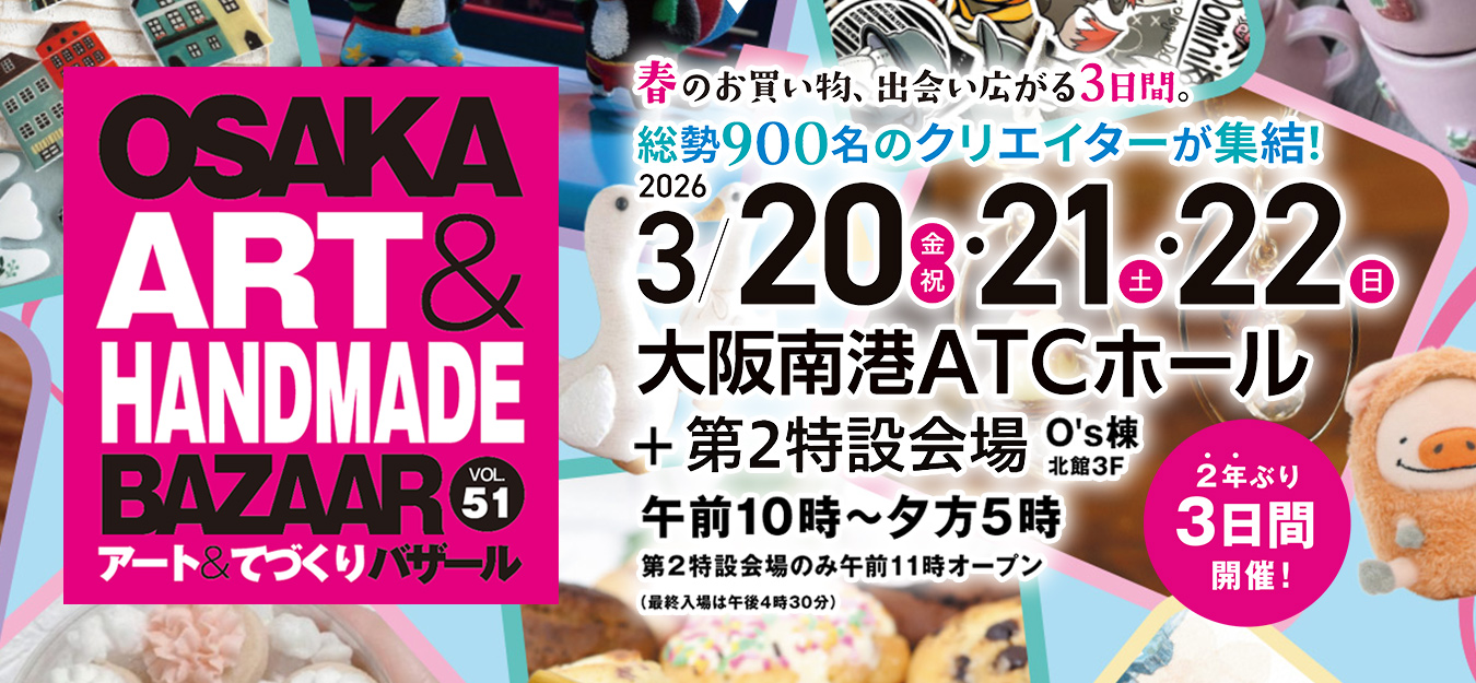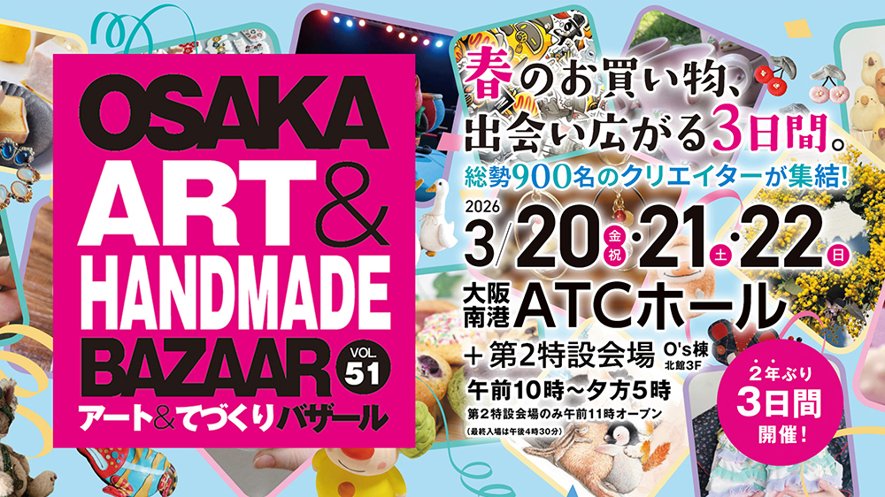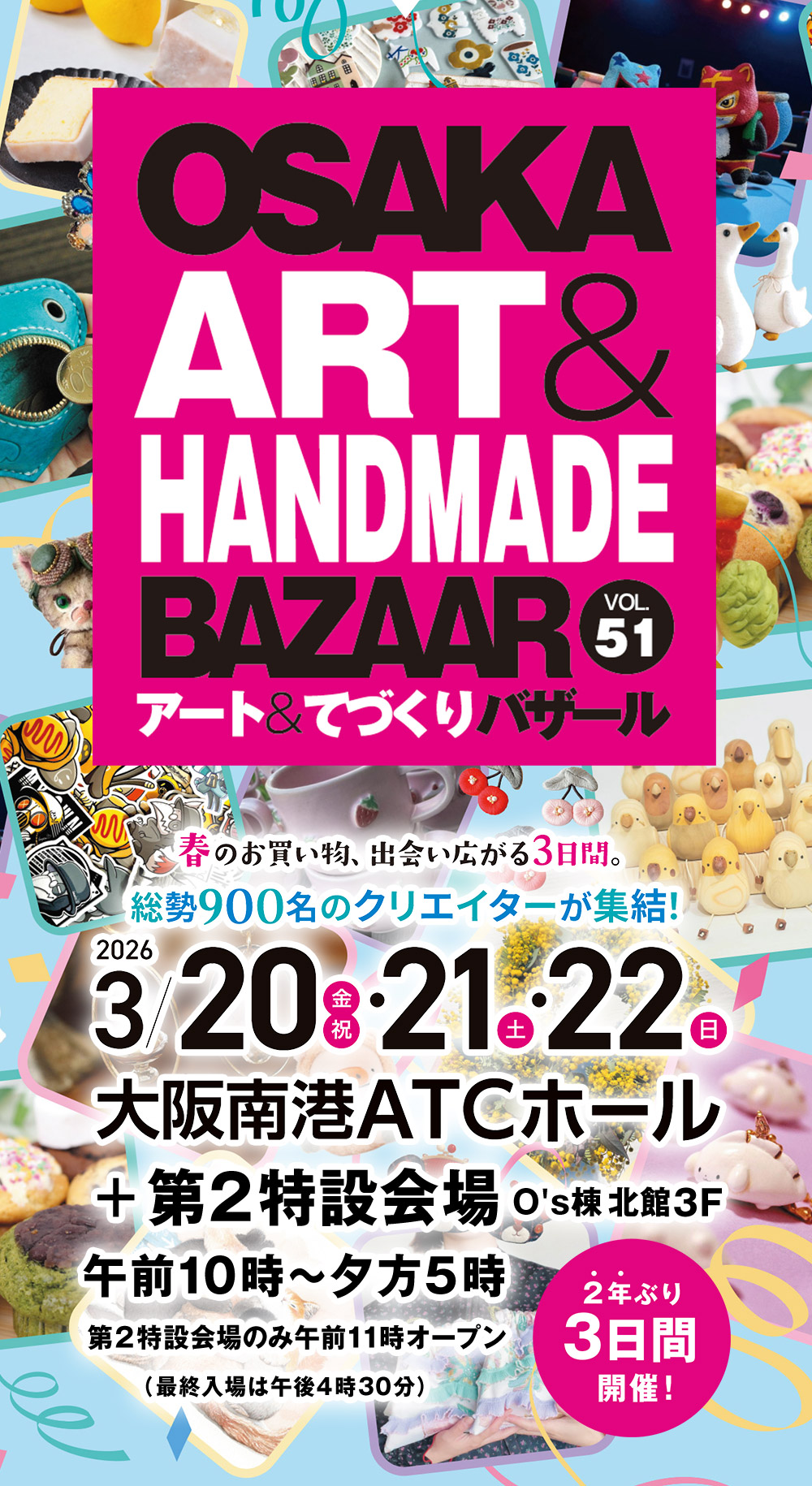 アート&てづくりバザールは関西最大級の屋内型のアート&ハンドメイドイベントです。アクセサリー、イラスト、布作品、レザー、陶芸、木工、クラフト、服飾、ガラス、フードなど様々なジャンルのアート、ハンドメイド作家が日本全国から大集合。オリジナルの作品の展示・販売で会場は賑わいます。