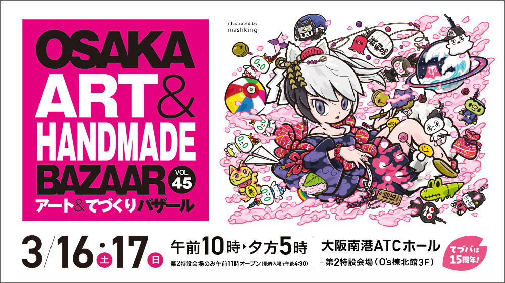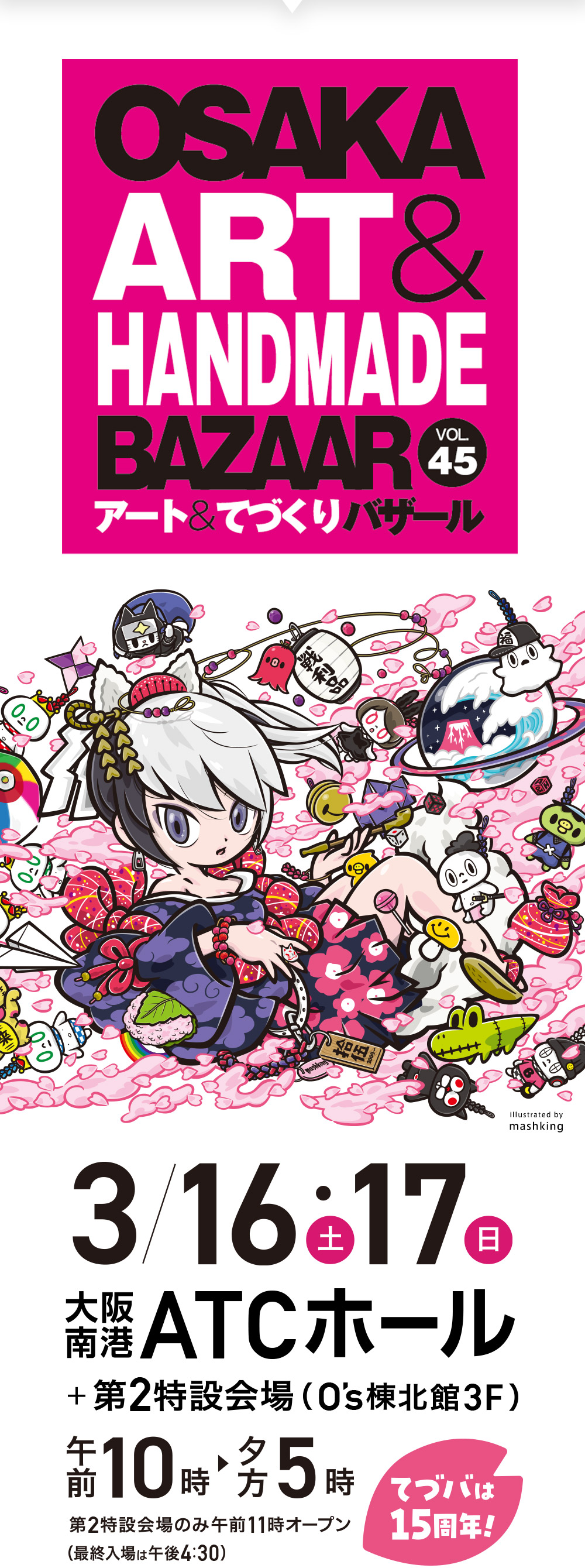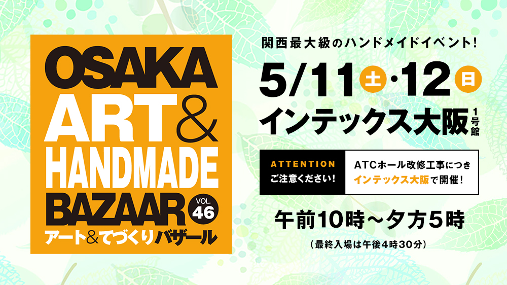 アート&てづくりバザールは関西最大級の屋内型のアート&ハンドメイドイベントです。アクセサリー、イラスト、布作品、レザー、陶芸、木工、クラフト、服飾、ガラス、フードなど様々なジャンルのアート、ハンドメイド作家が日本全国から大集合。オリジナルの作品の展示・販売で会場は賑わいます。