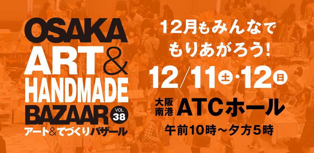 | 2021.9.21 | 「OSAKAアート&てづくりバザールVOL.37」開催終了いたしました。ご来場いただきましたみなさま、ご出店いただきましたみなさま、本当にありがとうございました!次回は、12月11日(土)・12日(日)に同じくATCホールで開催する「OSAKAアート&てづくりバザールVOL.38」にてお会いできることを楽しみにしております♪ |
