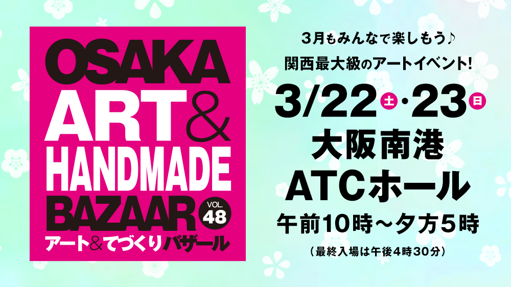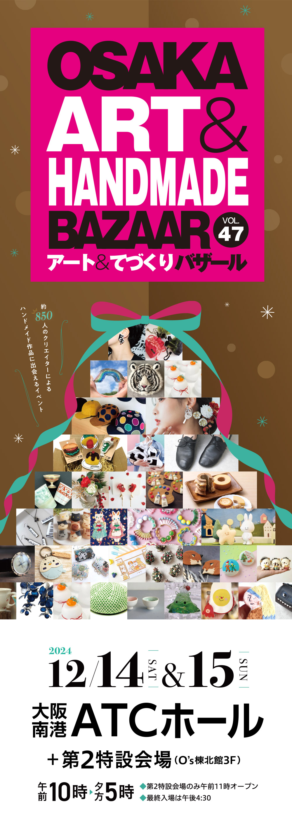 | 2024.12.17 | 出店者の皆さん、ご来場いただきました皆さん、晴天に恵まれた2日間本当にありがとうございました。素敵な時間を過ごしていただけましたでしょうか?これからも、アート&てづくりバザール(てづバ)をどうぞよろしくお願いします。次回は2025年3月22日(土)・23日(日)の2日間♪詳しくはこちら |