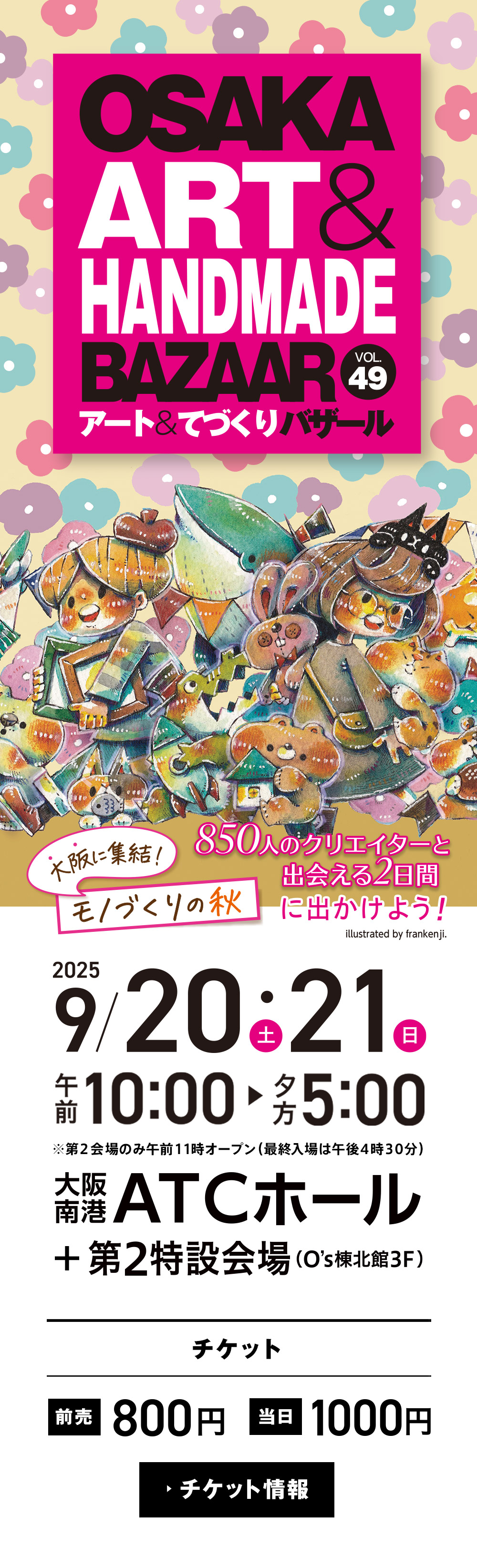 | 2025.9.24 | てづバVOL.49終了いたしました!ご出店、ご来場いただいたみなさま、ありがとうございました♥次回のてづバは…2025年12月20日(土)・21日(日)の2日間♪記念すべき第50回目の開催です!!お楽しみに~♪詳しくはこちら |