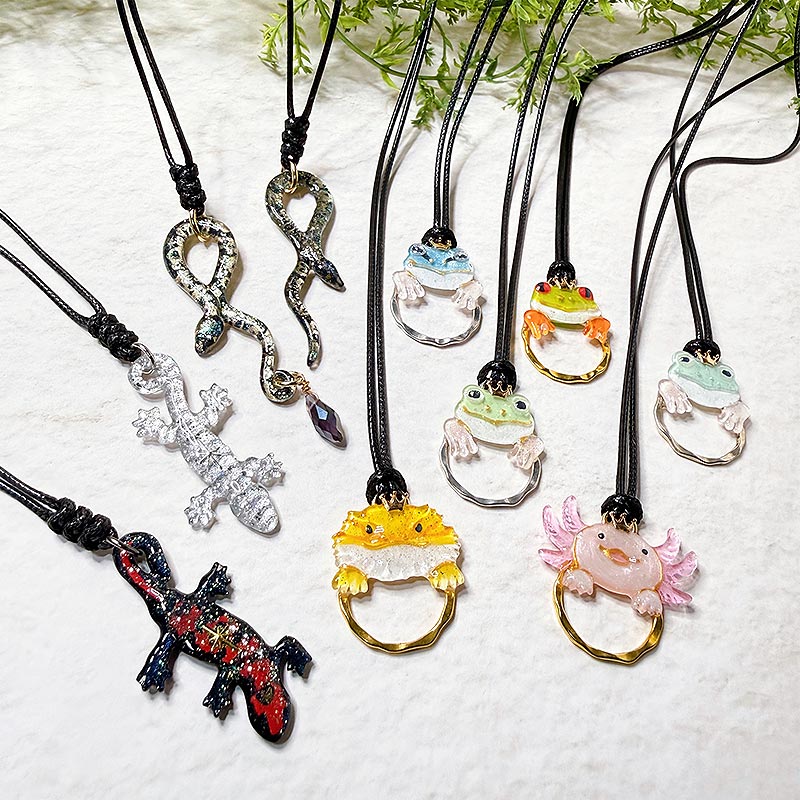 アクセサリー(アカハラ・ヤモリ・ボールパイソンのネックレス/フトアゴ・イエアメ・アマガエル・アカメ・ツノガエル・ウーパールーパーのメガネホルダー)