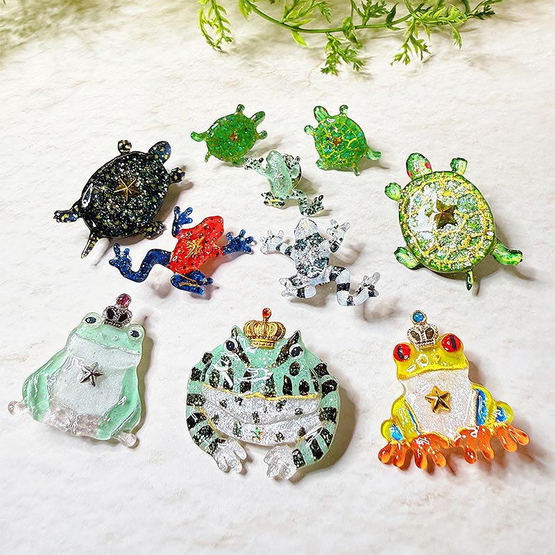アクセサリー(アカメアマガエル・ツノガエル・イエアメガエル・イチゴヤドクガエル・ミルキーフロッグ・ミシシッピアカミミガメ・キボシイシガメのブローチ/ミシシッピアカミミガメ・モウドクフキヤガエルのピンズ)