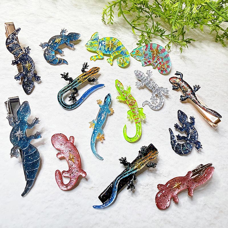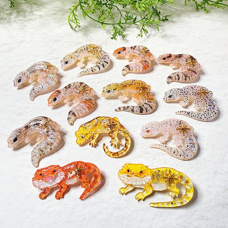 アクセサリー(ニシアフ・レオパ・アカハラ・オオサンショウウオのネクタイピン/ニホントカゲのヘアクリップ/エボシ・パンサーカメレオン・ヤモリ・マダガスカルヒルヤモリ・アオマルメヤモリ・レオパ・ニシアフ・ニホントカゲ・オオサンショウウオのブローチ)