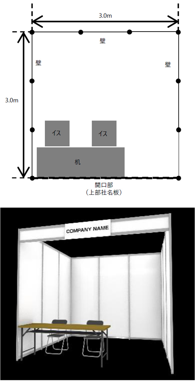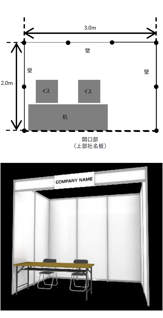 ※左記上記イラストは、タイプC(1小間)のイメージです。備品および電源関係(コンセント・照明など)はブースに付属しておりませんので、必要な場合はオプション備品リスト(別途・有料)よりお申込みください。オプション備品のご請求については、指定施工会社より請求いたします。予算計上の関係で請求書の記載内容など、ご調整が必要な場合は運営事務局までご連絡ください。 ※角小間については、見通し確保のため通路側のサイドパネルは付きません。 ※出展申込について、1社・団体あたりの小間数の上限は設けておりません。ただし、会場のスペースの都合で、お申込の際、ご希望の小間数が確保できない場合は、全体調整・協議をさせていただく場合がございます。6小間以上のスペースをご希望の場合は、お早めにご相談ください。 |