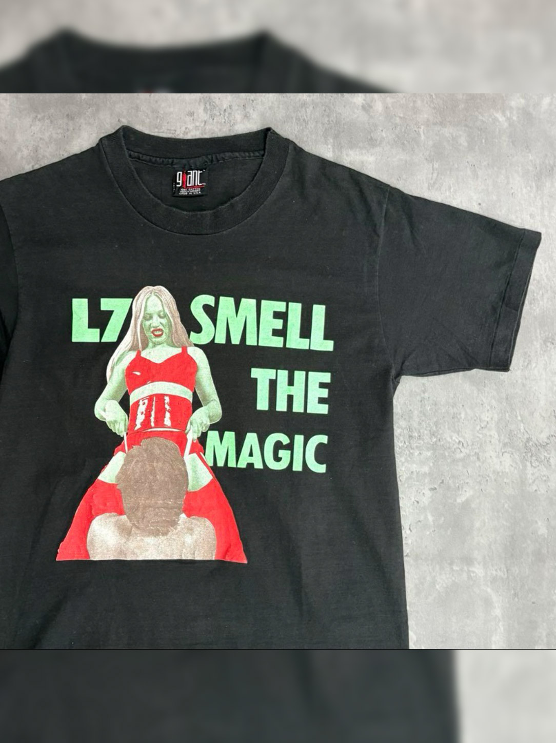 80年代を代表するガールズバンド L7 の2ndアルバムのSMELL THE MAGICのジャケデザインのTシャツ。