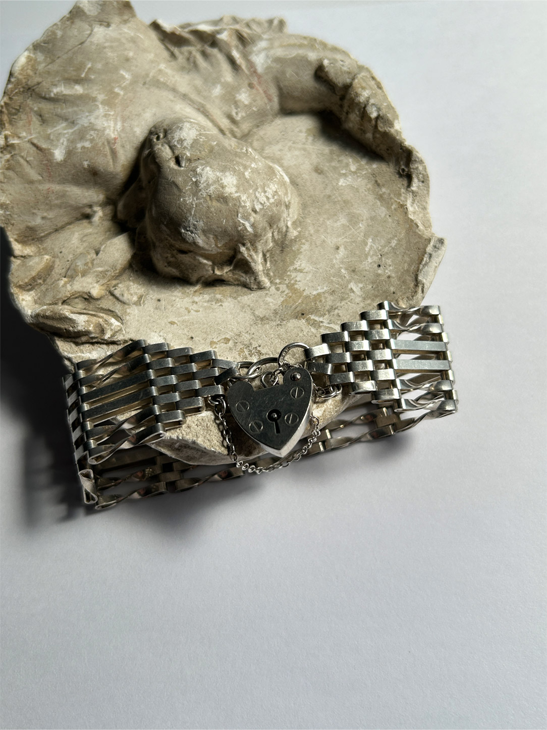 イギリスを象徴するゲートチェーンのブレスレット。ハートのパドロックで装着するデザインもアイコニック