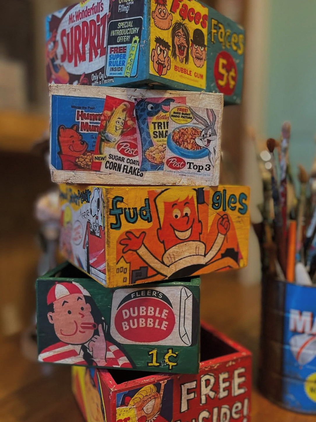 木箱をアメリカンビンテージ風にペイント、コラージュしています。大きさはL/M/Sと揃えています。