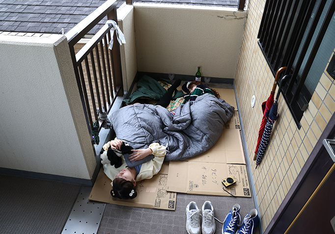 すると突然、先輩の提案でマンションの玄関先で外泊することに…。