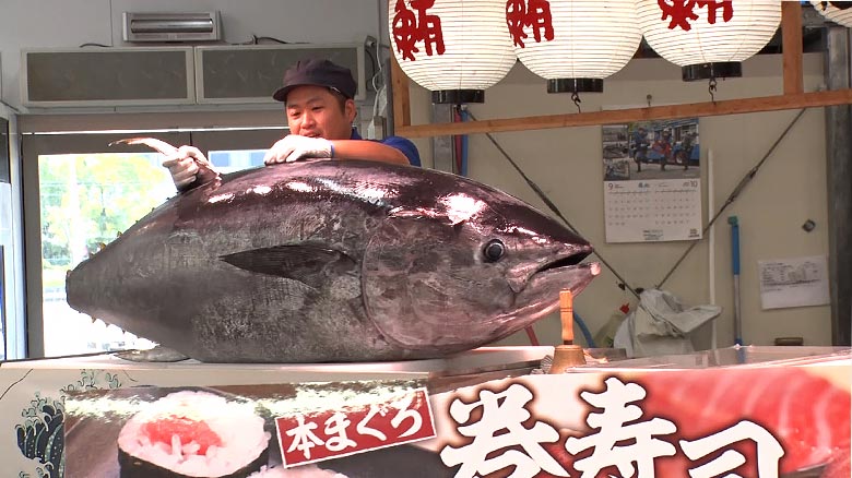 新鮮な魚介が揃う「まぐろパーク」でマグロの解体ショーを見学