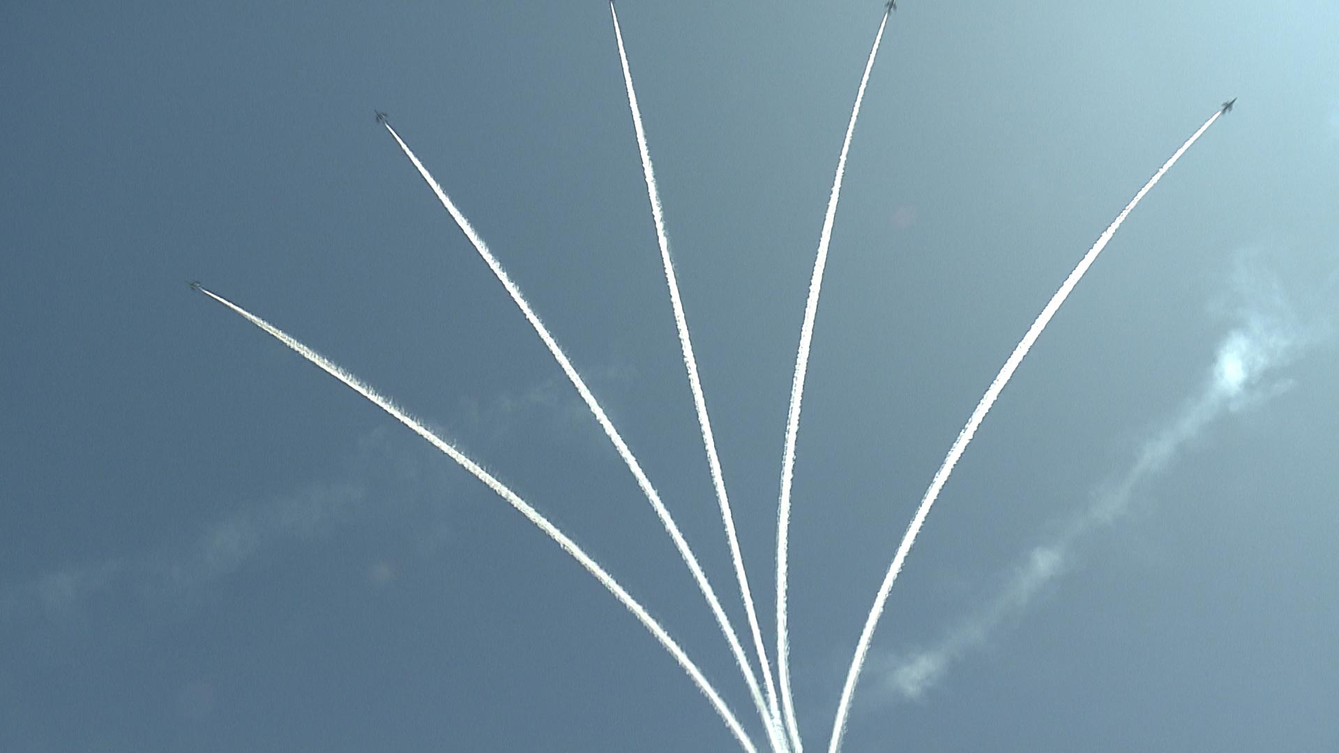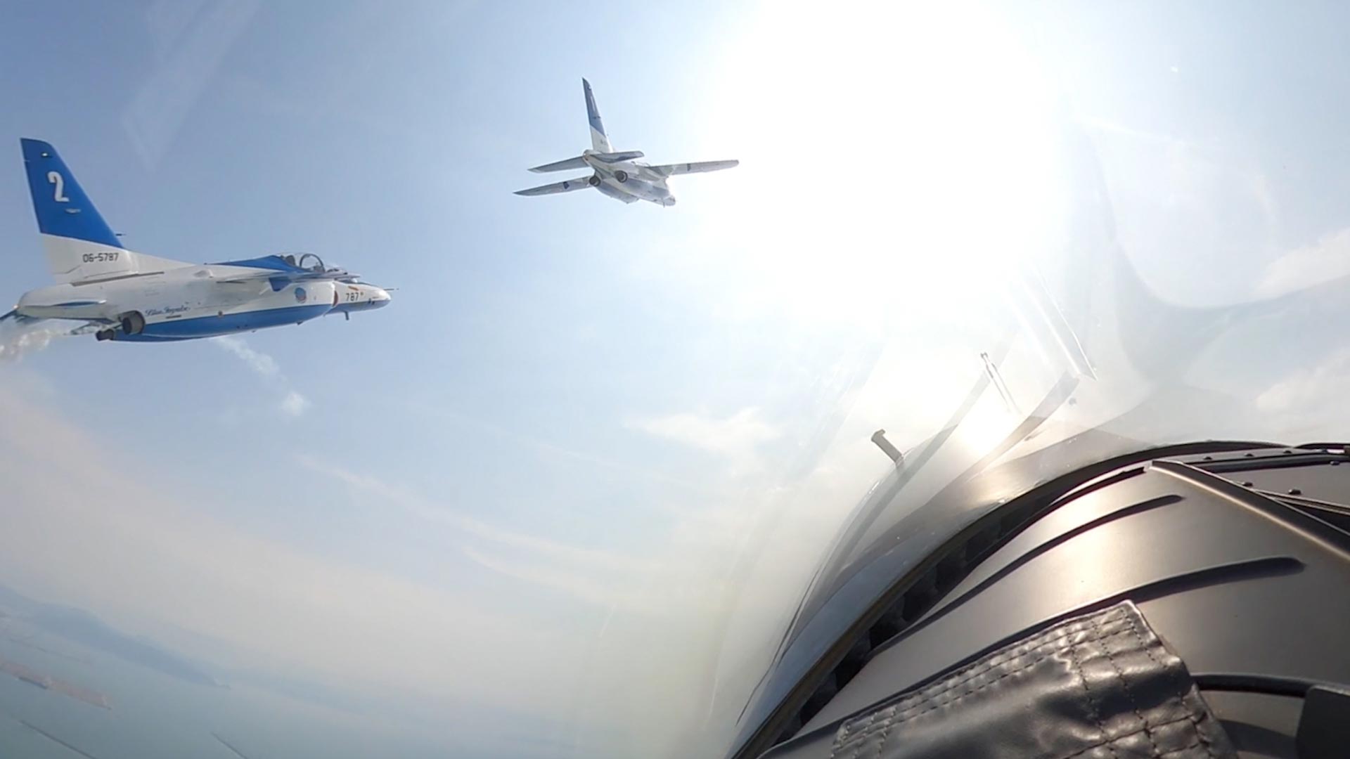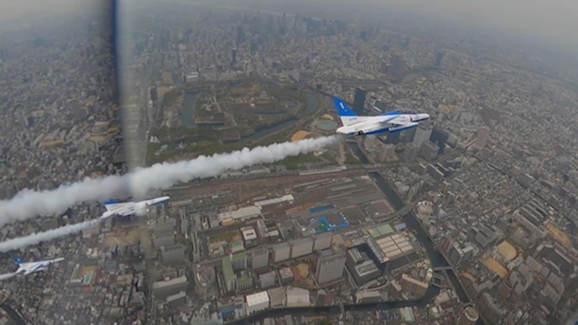 わずか数十メートルの間隔で編隊飛行する航空自衛隊の精鋭・ブルーインパルス。