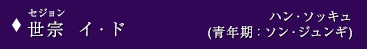 朝鮮王朝4代王。父王・太宗による血の粛清を目の当たりにして心に深い傷を負い、父とは異なる王の姿を目指す。民を愛し、民の言葉を愛し、身分の低い者にも対等に