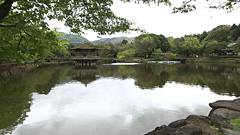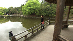 奈良公園・鷺池に浮かぶ檜皮葺き(ひわだぶき)、八角堂形式(六角形)のお堂。水面に写る姿が美しく、水辺の憩いの場となっている。