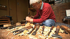 今も昔ながらの制作方法で独自の作品を作り上げている讃岐一刀彫の宗家。琴平に生まれ育った伝統工芸の実演を軒先で間近に見ることも。