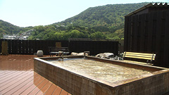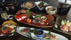なんと言っても自慢は360°の絶景が楽しめる展望露天風呂。料理は地元の旬の食材を使った会席料理が楽しめる。