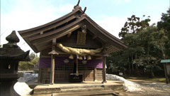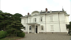 白亜の木造茅葺2階建て。建物内部の奧にある