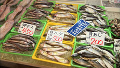 市場には地物の新鮮野菜や海産物などが並ぶ
