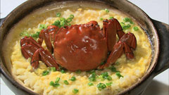 卵を持った川がにと、かに味噌が溶け出した黄色い出し汁。