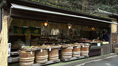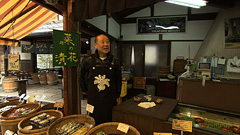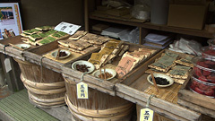 豊富な種類の漬物と佃煮が店頭に並びます。