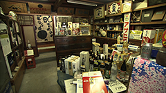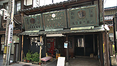 軒上に古い看板が3つ並ぶ地酒も扱うお酒の小売り店。