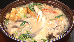 名物の酒粕鍋は酒粕と白味噌だし汁を混ぜた鍋。