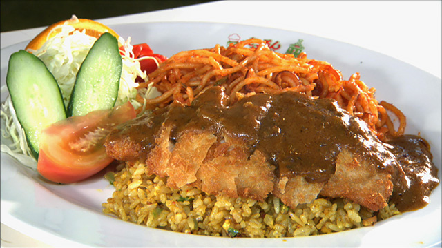 トンカツ、ナポリタン、ドライカレーを一緒に楽しめる