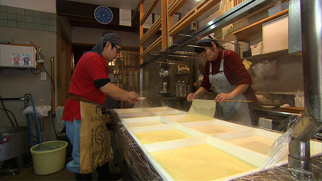 八坂通りにあるゆば専門店。店頭で出来立ての引き上げゆばをいただくことができる。