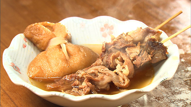 昭和22年創業の立ち飲みや。朝から常連さんで賑わっている。おでんや酒のアテは毎日お母さんが手作りしている。