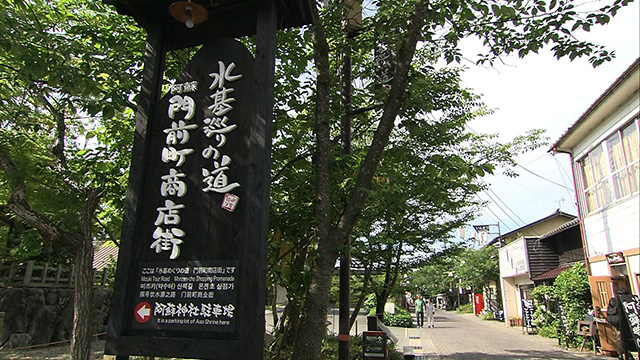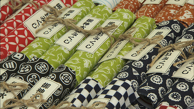 手ぬぐいに包まれた御神水おみくじが観光客に人気。