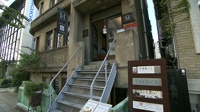 昭和レトロなビルの雰囲気にぴったりのおしゃれなカフェ。店先からは美味しそうな匂いが漂ってきます。