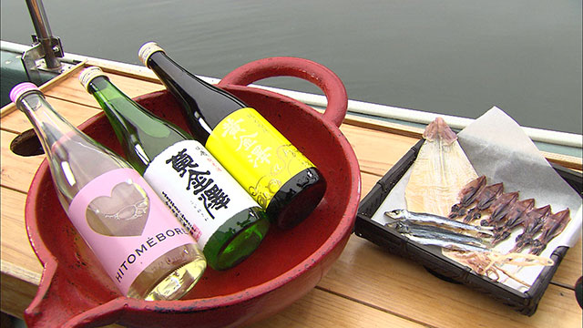 きき酒セットでは、オススメの日本酒3種と干物を船上でいただけます。