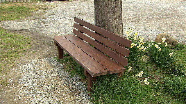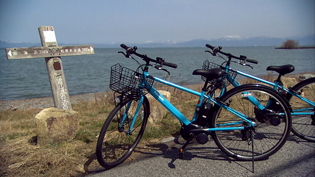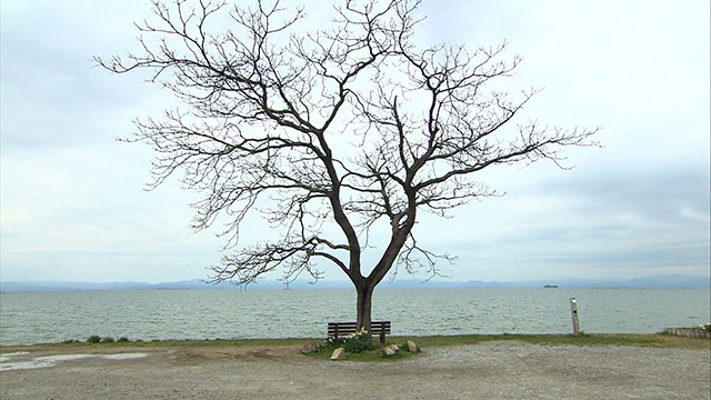 琵琶湖沿いにある木の下に置かれたベンチ。