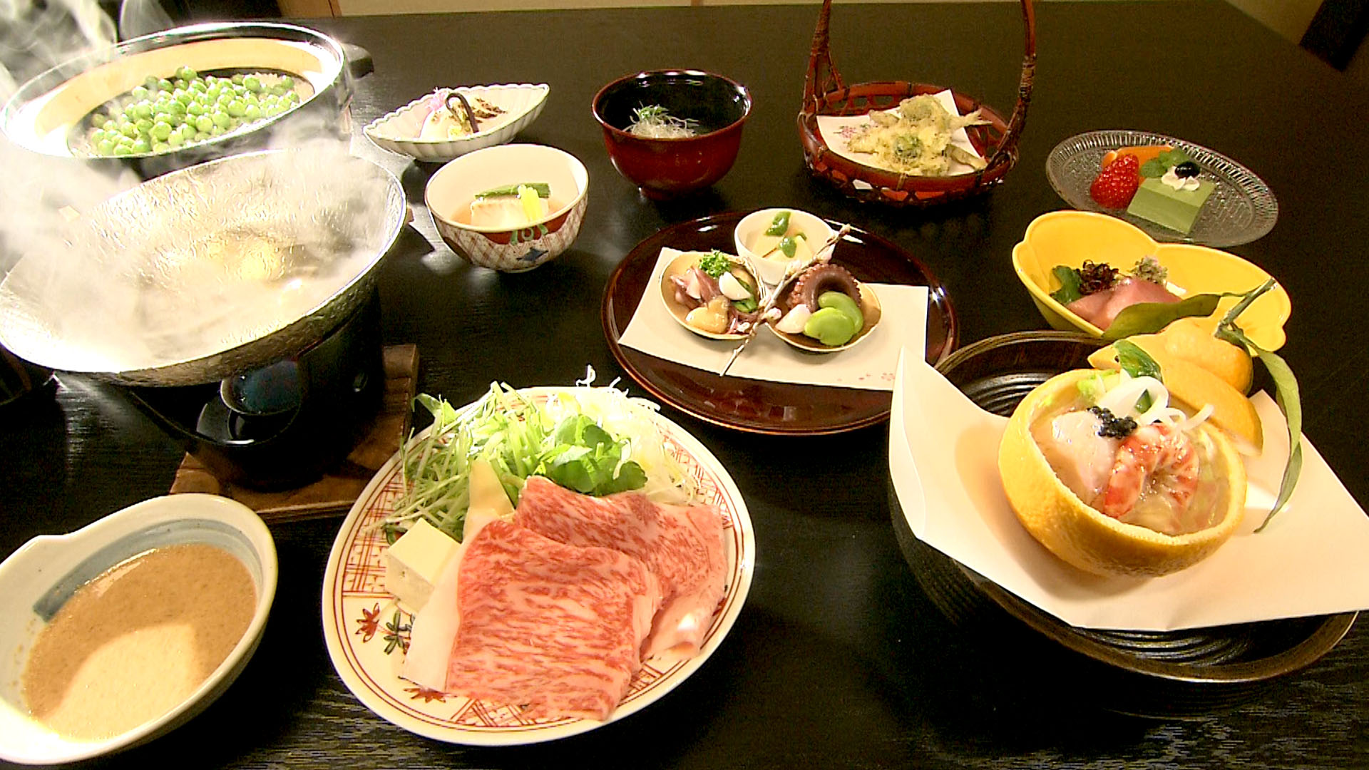 古都・奈良の食材、大和肉鶏や大和牛、旬の魚、野菜など季節に応じた懐石料理を楽しむことができる。