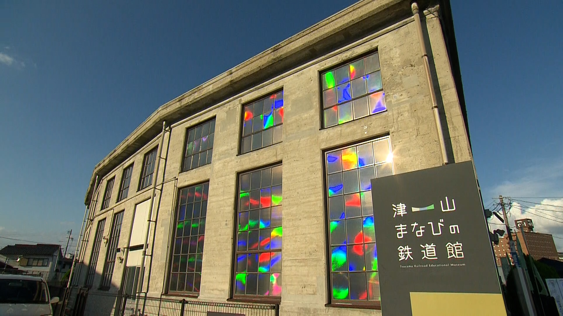 「森の芸術祭 晴れの国・岡山」の展示会場。車庫のガラス窓には特殊なシートが貼られており、自然光が差し込むと幻想的な虹色の景色が広がる。