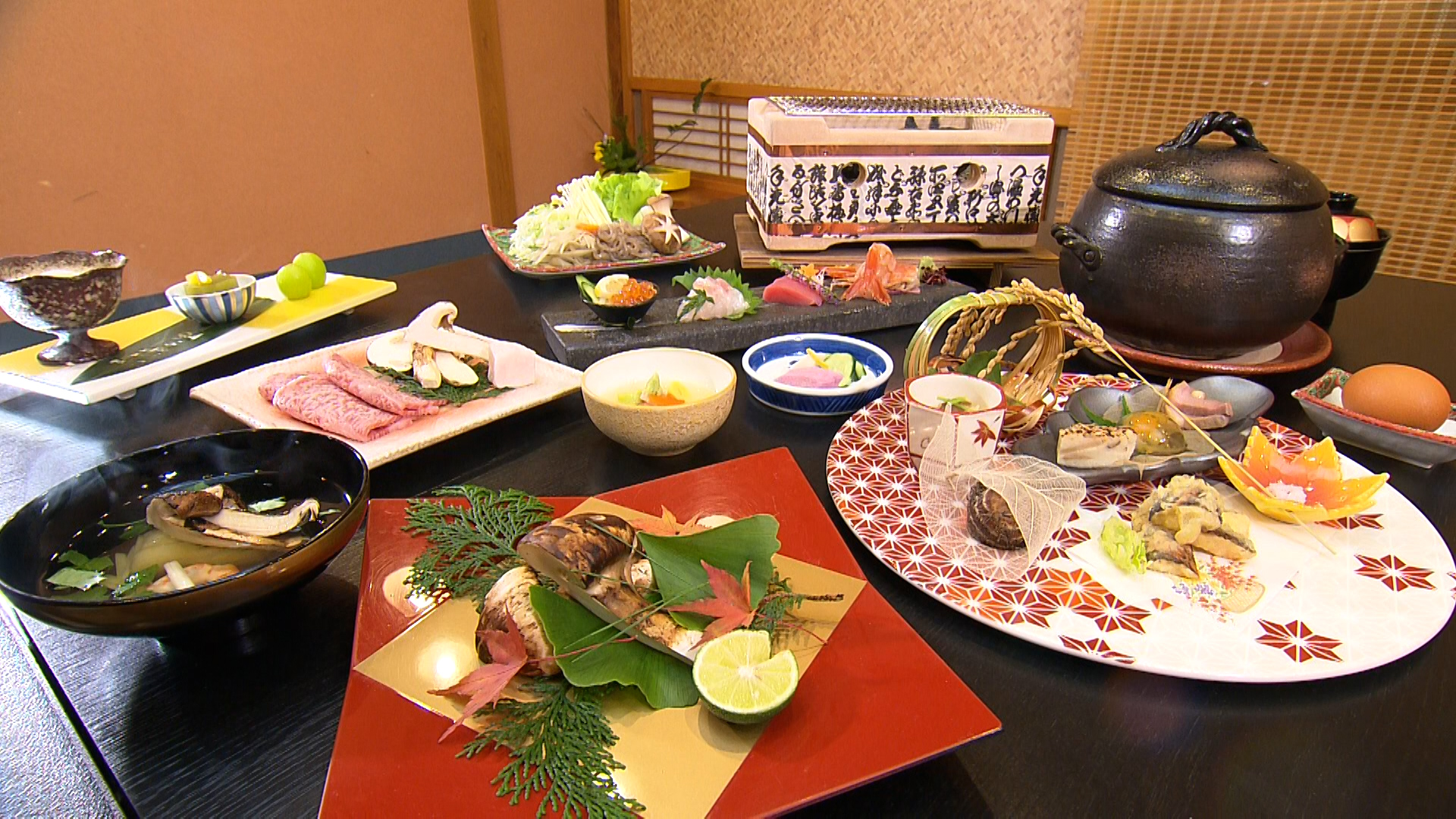 客室は広々とした贅沢な空間。季節の料理も味わえる。