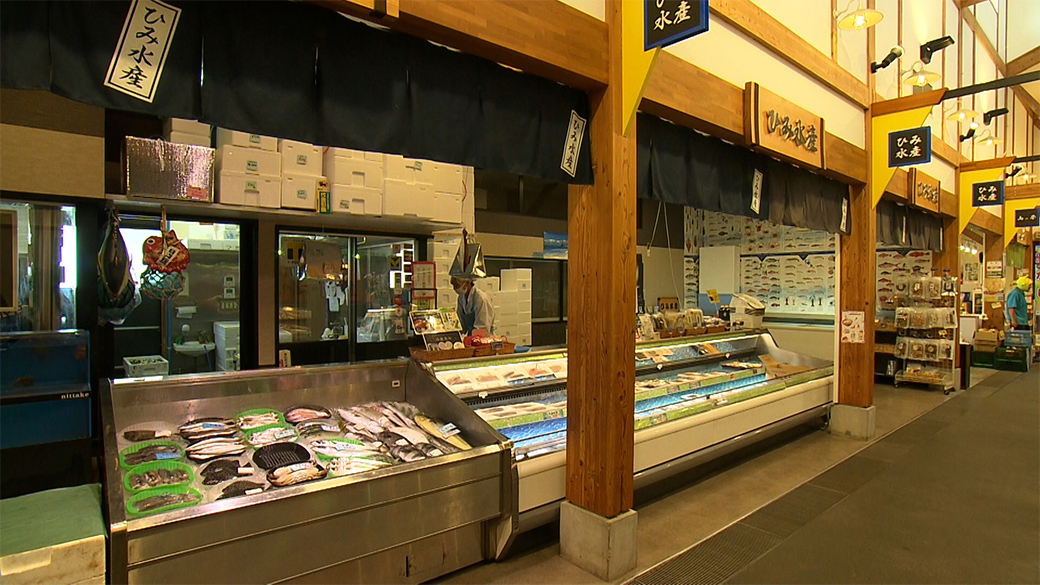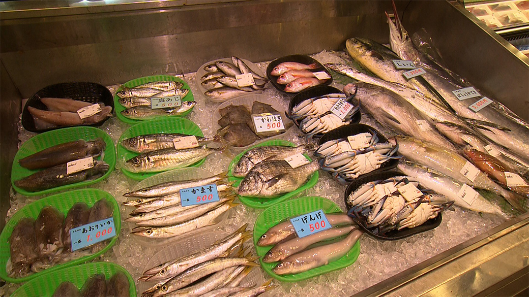 氷見で水揚げされた物を中心に新鮮な魚介類が並ぶ鮮魚店。