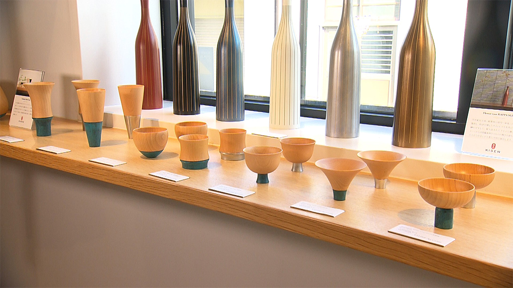 木と金属を掛け合わせたぐい呑みは海外でも人気で数々の賞も受賞している。