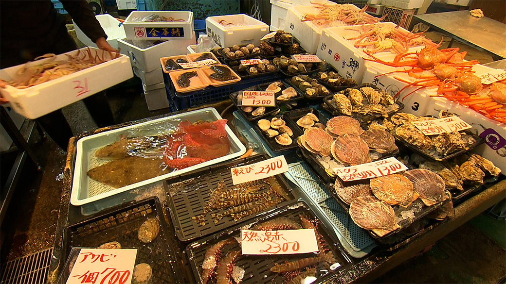 地元や全国から集まった、選りすぐりの魚介類・野菜などが並ぶ市場。