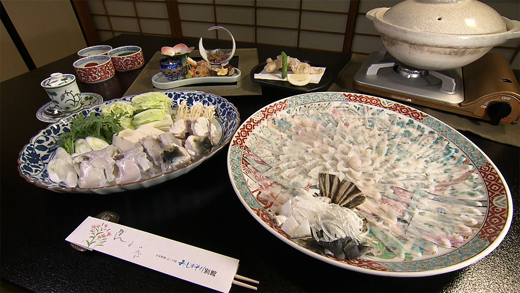 みもすそ川別館 関門海峡にほど近い、老舗の料亭旅館。贅沢なとらふくのフルコースをいただけ、中でもふく刺しは職人技が光る芸術的な逸品。 和洋室(とらふくフルコースプラン) 1泊2食付 2名1室 1人あたり 37,400円〜 とらふくヒレ酒 1,392円 -料理のみの場合- とらふくフルコース 1人18,975円※2名様より 山口県下関市みもすそ川町23-15 TEL: 083-222-3357