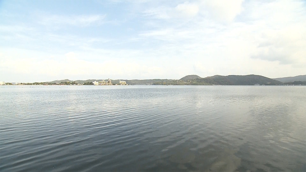 東郷湖羽合臨海公園内にある足湯、目の前に湖の絶景が広がる。