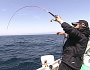 午前6時30分出船。午前6時50分、ポイントの田子島沖へと到着。ここ伊豆周辺では実釣開始が午前7時となる。そのため大塚は船上にて、仕掛けの入念な準備を行う。午前7時となり実釣開始、大塚は海中をイマジネーションしながらコマセワークを行う。コマセマダイ釣りでは棚を正確にキープする事がもっとも大切な要素となる。細かなアタリも逃さないよう、丁寧にコマセワークと棚切りを繰り返す。ついに、大塚のロッドに大きなアタリがきた!アタリと同時に強烈なヒキを見せるマダイ、このパワーこそ、マダイ釣りの最大の魅力である。上がってきたのは40cmクラスのマダイ。 さらなる大物を求めて大塚は気を抜くことなく攻め続ける。コマセワーク、棚切り、ドラグ設定すべての要素が完璧にそろったときマダイを呼び寄せる事が出来る。 マダイとの攻略法とダイナミックなファイトシーンを余すことなくお見せします! どうぞ、お楽しみに!!