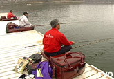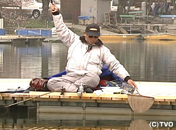 この日二人が訪れた丹生湖には多くの釣り師達がこの季節のヘラブナ釣りを楽しもうと駆けつけていた。二人はボートではなく桟橋からの実釣。しかしこの日は気温と共に水温も低く今ひとつコンディションが良くないようだ。その活性の低い状況を二人の名手は如何に打開していくかが焦点となる。岡崎は21尺の長い竿をセレクト、浜田は16尺の竿で実釣開始。午前中時間が経つにつれて天候は雨雲があつくなってくる。