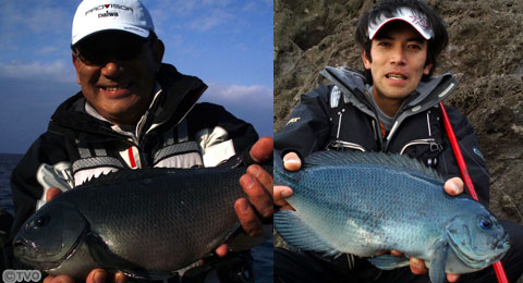 一方、榊はハリス1.7号で沖目を探るがアタリは無い。成長した所を見せたい、早く一尾が欲しいという気持ちが空回り、釣り座を頻繁にかわり、かえって墓穴を掘ってしまう。鵜澤は榊が釣っていた場所に入り、潮目を丁寧に探って45センチの良型をヒット。そんな鵜澤の姿を見て榊も我慢して流し続けようやく35センチをゲットした。もっと大きいのを狙い磯を替る二人。しかし深く沈めるとブダイの猛攻。