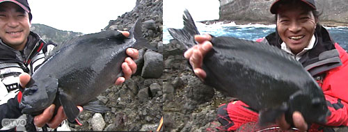 さらにこの後、波が大きくなり釣りが困難な状況になってきたため、実釣はストップ。初日は終了となった。そして、釣行2日目。この日も、海は決して穏やかな状態ではないが、昨日よりは、落ち着いている。上がったポイントは中木エリアの西側に位置する下加賀根。この日も2人は、沖目と足元を攻める。