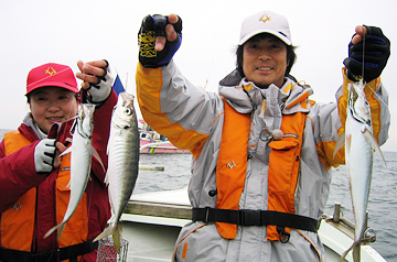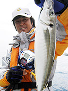 仕掛けを着底させ、マキエを振り出し待つこと数分・・・。北本が最初にヒット。これがアジの引きかと疑うぐらい竿がギュンギュンと曲がる。上がってきたのは35センチの立派なアジ。続けて真美さんにも来た。鋭い引きに思わず声が上がる。そしてアジを手に持った真美さんから本音がこぼれる。「美味しそう!」 |