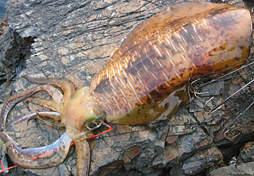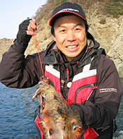 一投目、活きアジを足元から泳がせイカのアタリを待つ。すると10分も経たないうちに、イカが抱きついた。頃合を見てヤエンを投入。上がってきたのは1.5kgの良型である。