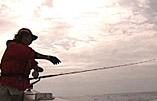 そして今回行うのがパヤオ釣り、パヤオとは水深1000m以上の沖合に浮漁礁の事で、ロープに付着した海藻類を補食するために小魚が集まり、その小魚を食べに中型魚が、中型魚を食べに大型魚がといった仕組みになっている。港を出てから少し船を走らせ最初のポイントに到着ビッグサイズのアタリを待つ大塚、そんな中いきなりアタリがきた!!やりとりを楽しむ大塚の前に顔を出したのはシイラ、幸先の良いスタートだ。このあともシイラは顔を出すもののキハダはなかなか顔を出してくれない…マグロは最強のターゲットだと大塚は言う。やはり簡単に釣る事はできないのだろうか…その瞬間、大塚のロッドが大きくしなる、しかも今までとは比べ物にならないような強い引きだ!!「重い!重っい!」大塚の声がその魚のでかさを物語る!!このビッグサイズの魚との格闘を大塚は制する事ができるのか!?どうぞお楽しみに!! |