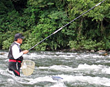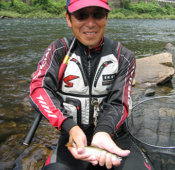 林順二・アユマスターズで一昨年・昨年と二回連続で準優勝している実力派トーナメンター。もう一人は吉田健二・昨年まで四回連続でマスターズに出場し、2002年には三位になっている、こちらも実力派トーナメンターである。シビアな釣りが要求されるトーナメンター二人が、今回は大アユ釣りの醍醐味を存分に楽しむ。